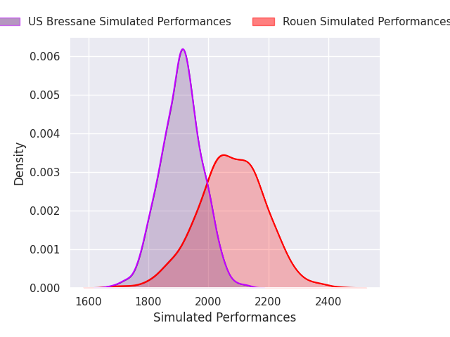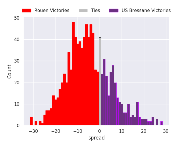 Each club has a rating and a rating deviation (similar to a Glicko rating), and expected performances can be generated. This allows for simulated matches and spreads like the ones below.