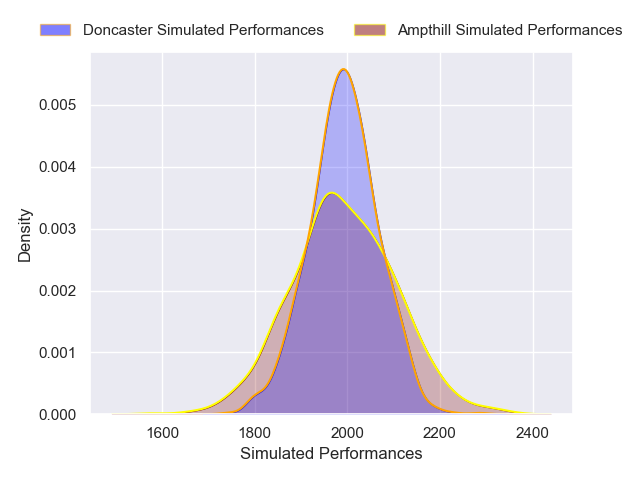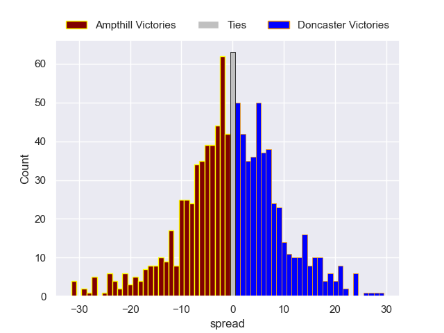 Each club has a rating and a rating deviation (similar to a Glicko rating), and expected performances can be generated. This allows for simulated matches and spreads like the ones below.