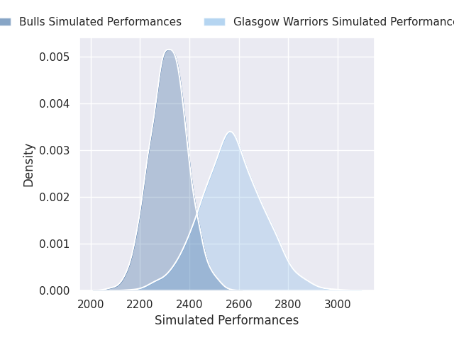 Each club has a rating and a rating deviation (similar to a Glicko rating), and expected performances can be generated. This allows for simulated matches and spreads like the ones below.