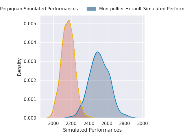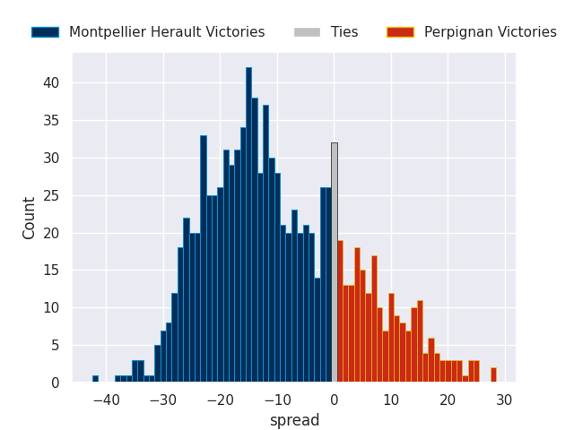 Each club has a rating and a rating deviation (similar to a Glicko rating), and expected performances can be generated. This allows for simulated matches and spreads like the ones below.