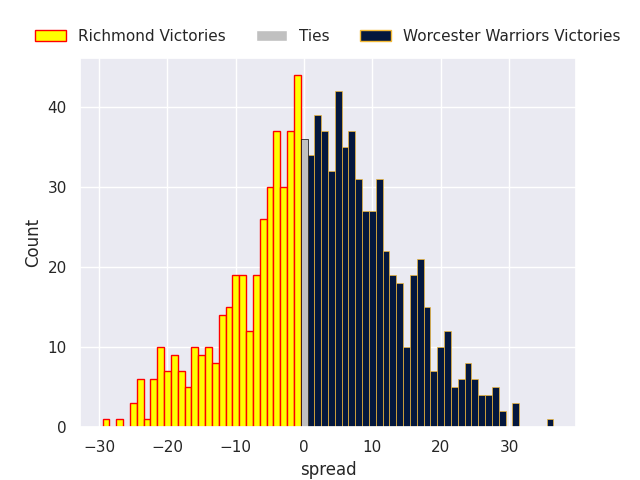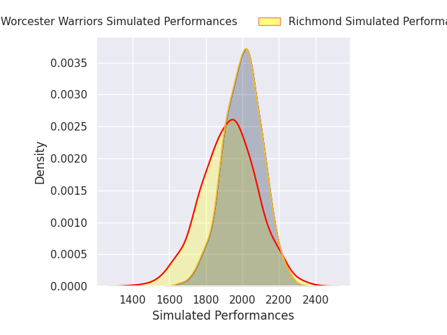 Each club has a rating and a rating deviation (similar to a Glicko rating), and expected performances can be generated. This allows for simulated matches and spreads like the ones below.