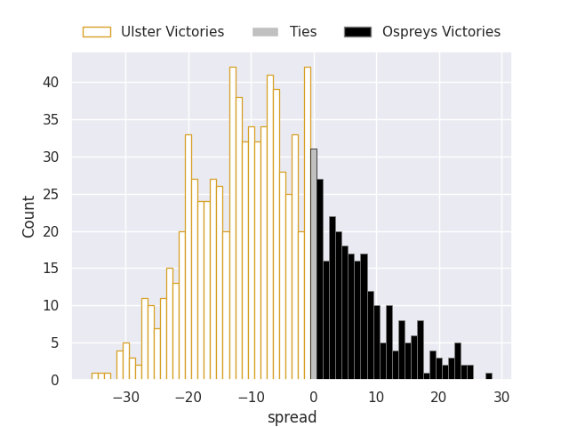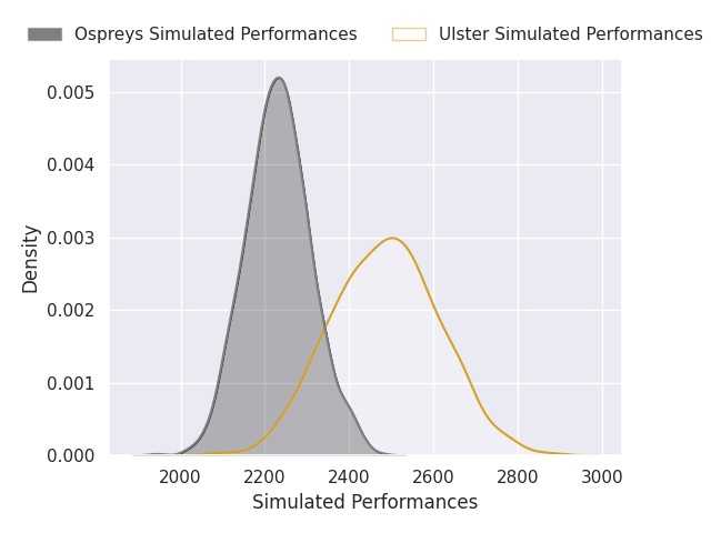 Each club has a rating and a rating deviation (similar to a Glicko rating), and expected performances can be generated. This allows for simulated matches and spreads like the ones below.