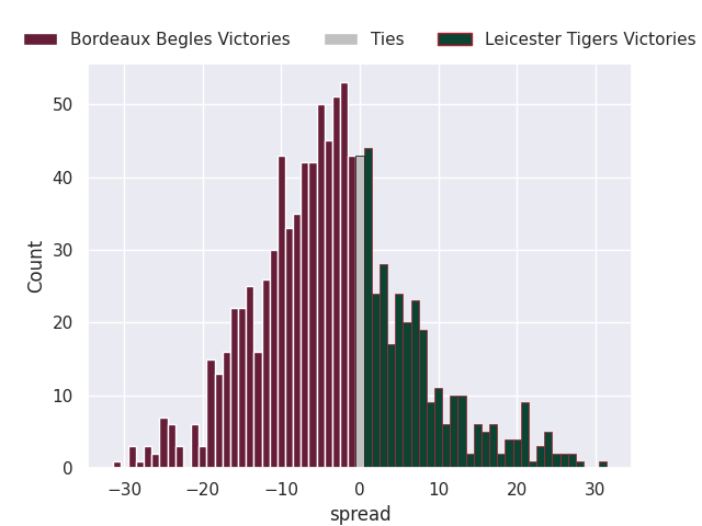 Each club has a rating and a rating deviation (similar to a Glicko rating), and expected performances can be generated. This allows for simulated matches and spreads like the ones below.