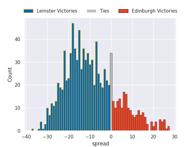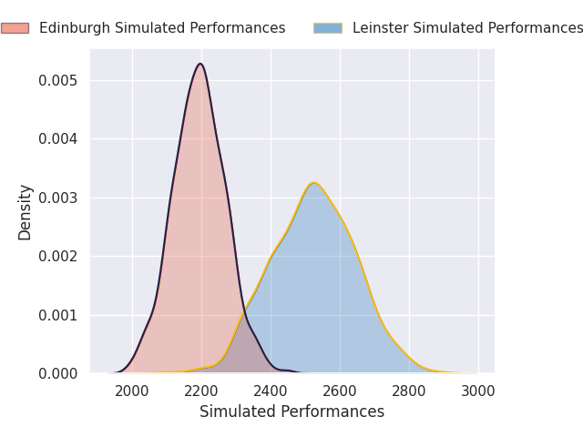 Each club has a rating and a rating deviation (similar to a Glicko rating), and expected performances can be generated. This allows for simulated matches and spreads like the ones below.
