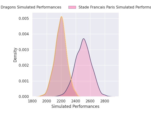 Each club has a rating and a rating deviation (similar to a Glicko rating), and expected performances can be generated. This allows for simulated matches and spreads like the ones below.
