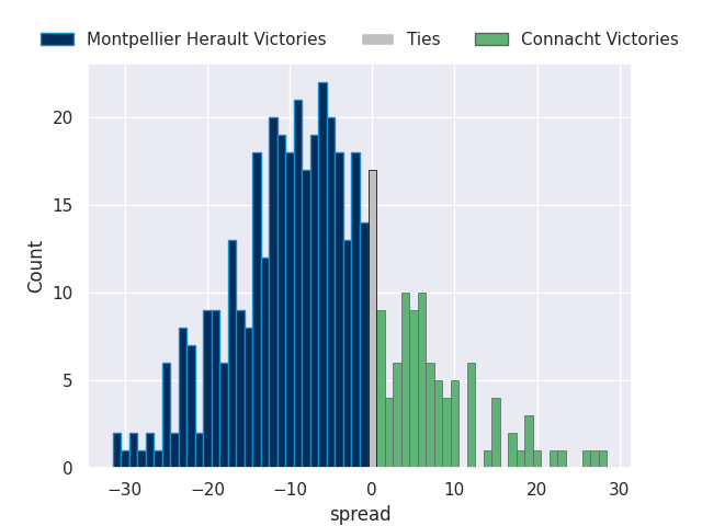 Each club has a rating and a rating deviation (similar to a Glicko rating), and expected performances can be generated. This allows for simulated matches and spreads like the ones below.