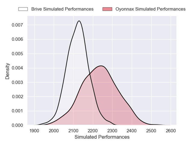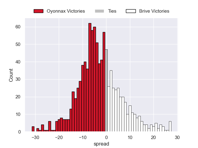 Each club has a rating and a rating deviation (similar to a Glicko rating), and expected performances can be generated. This allows for simulated matches and spreads like the ones below.