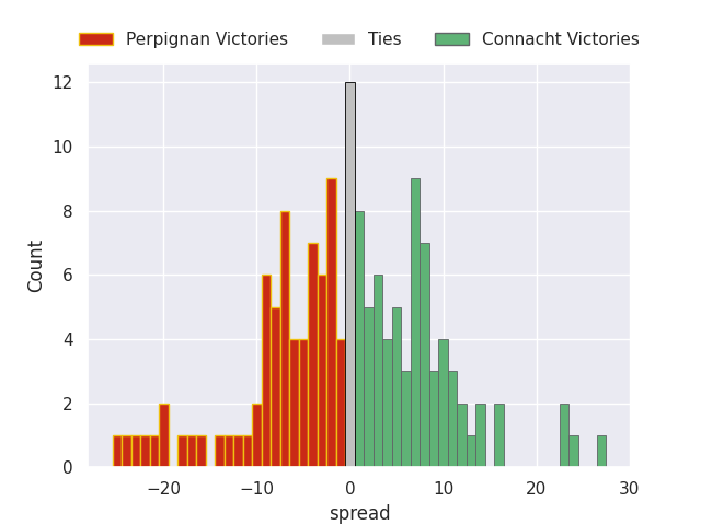 Each club has a rating and a rating deviation (similar to a Glicko rating), and expected performances can be generated. This allows for simulated matches and spreads like the ones below.