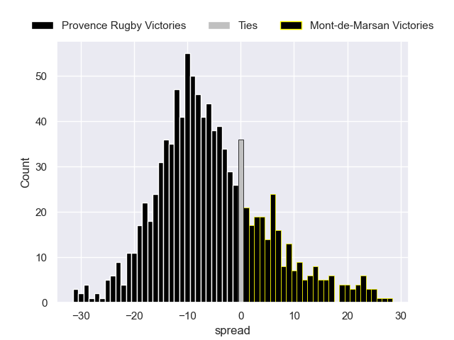Each club has a rating and a rating deviation (similar to a Glicko rating), and expected performances can be generated. This allows for simulated matches and spreads like the ones below.
