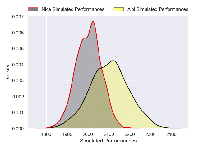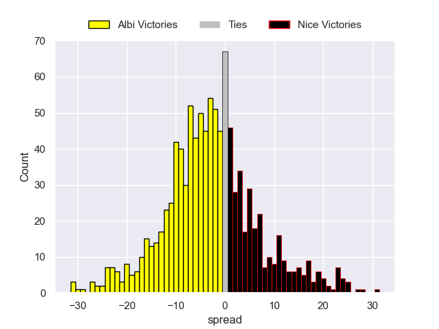 Each club has a rating and a rating deviation (similar to a Glicko rating), and expected performances can be generated. This allows for simulated matches and spreads like the ones below.