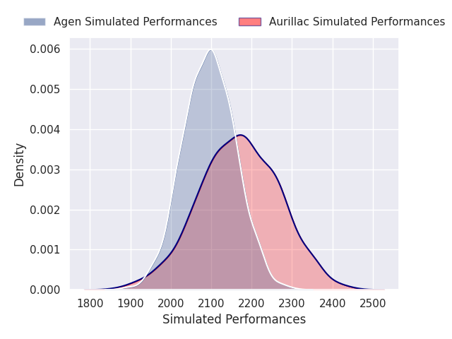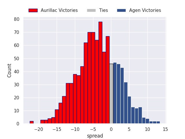 Each club has a rating and a rating deviation (similar to a Glicko rating), and expected performances can be generated. This allows for simulated matches and spreads like the ones below.