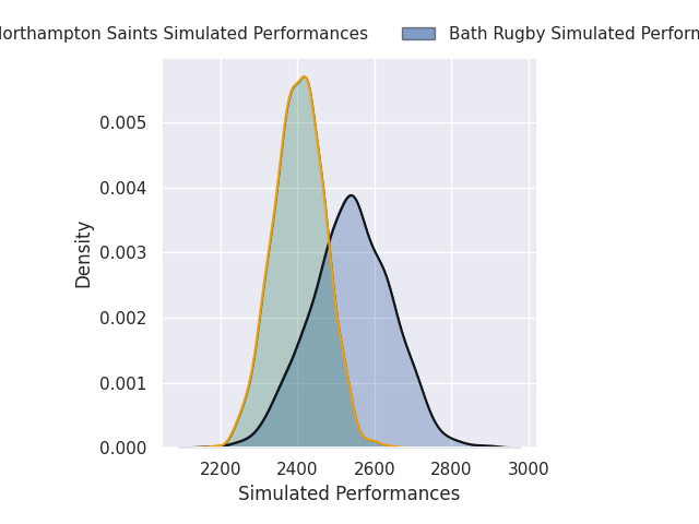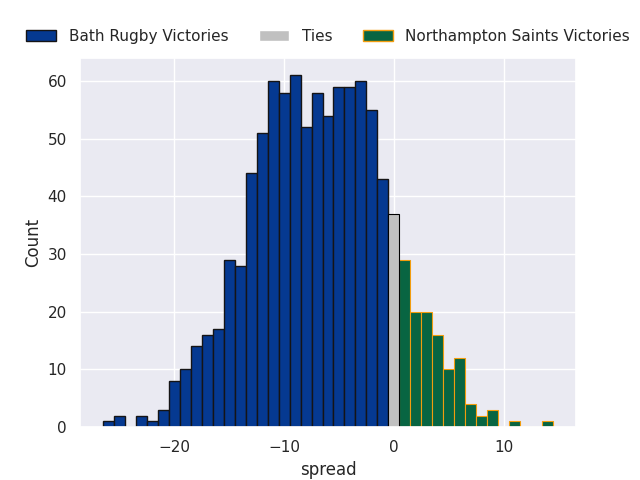 Each club has a rating and a rating deviation (similar to a Glicko rating), and expected performances can be generated. This allows for simulated matches and spreads like the ones below.