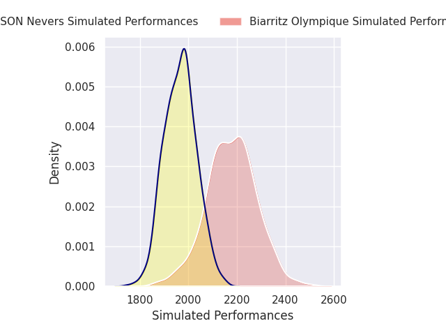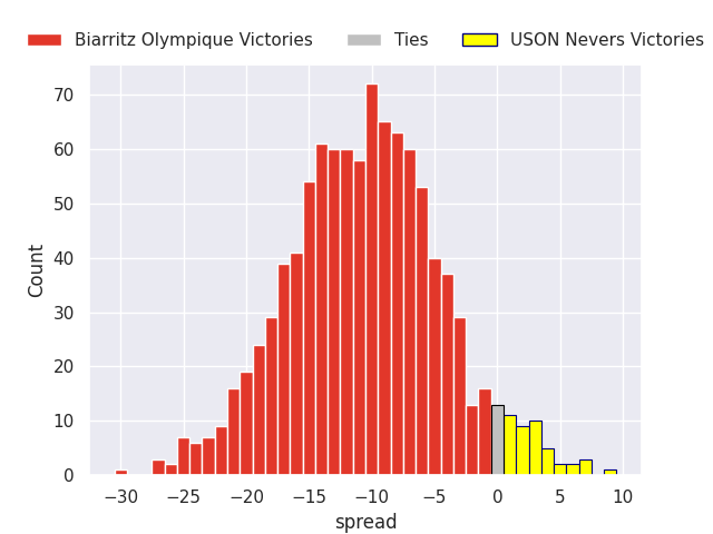 Each club has a rating and a rating deviation (similar to a Glicko rating), and expected performances can be generated. This allows for simulated matches and spreads like the ones below.