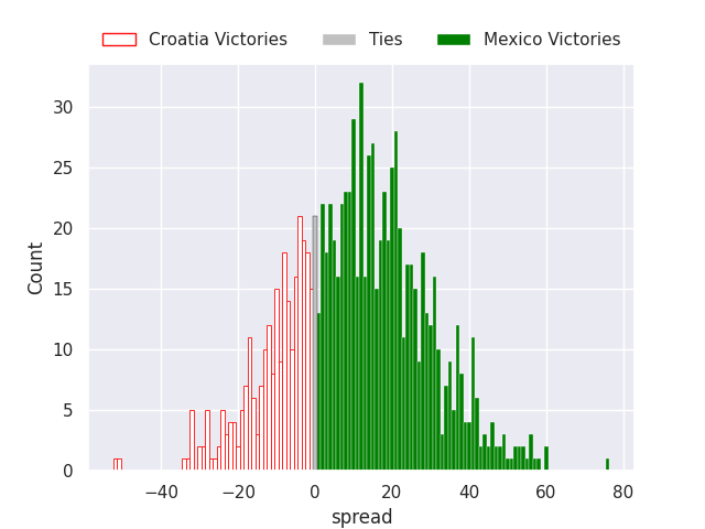 Each club has a rating and a rating deviation (similar to a Glicko rating), and expected performances can be generated. This allows for simulated matches and spreads like the ones below.
