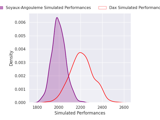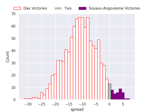 Each club has a rating and a rating deviation (similar to a Glicko rating), and expected performances can be generated. This allows for simulated matches and spreads like the ones below.