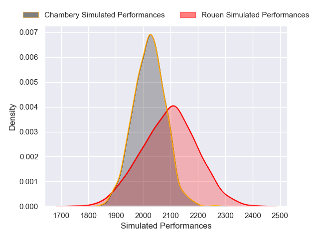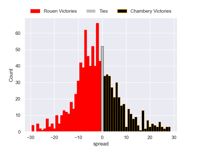 Each club has a rating and a rating deviation (similar to a Glicko rating), and expected performances can be generated. This allows for simulated matches and spreads like the ones below.