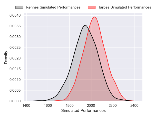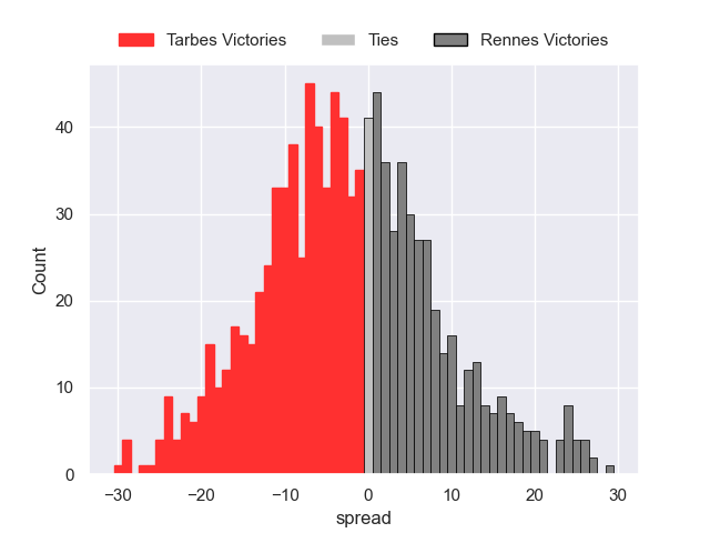 Each club has a rating and a rating deviation (similar to a Glicko rating), and expected performances can be generated. This allows for simulated matches and spreads like the ones below.
