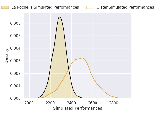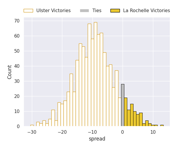 Each club has a rating and a rating deviation (similar to a Glicko rating), and expected performances can be generated. This allows for simulated matches and spreads like the ones below.