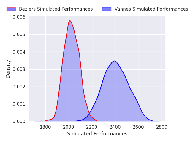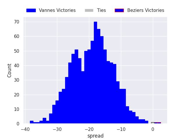 Each club has a rating and a rating deviation (similar to a Glicko rating), and expected performances can be generated. This allows for simulated matches and spreads like the ones below.