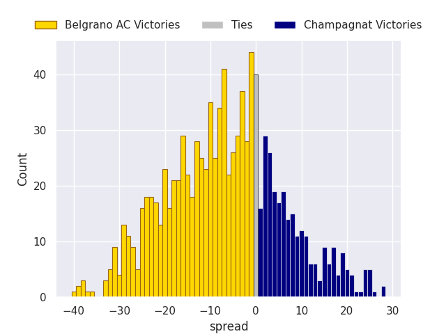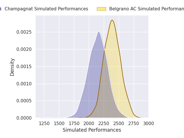 Each club has a rating and a rating deviation (similar to a Glicko rating), and expected performances can be generated. This allows for simulated matches and spreads like the ones below.