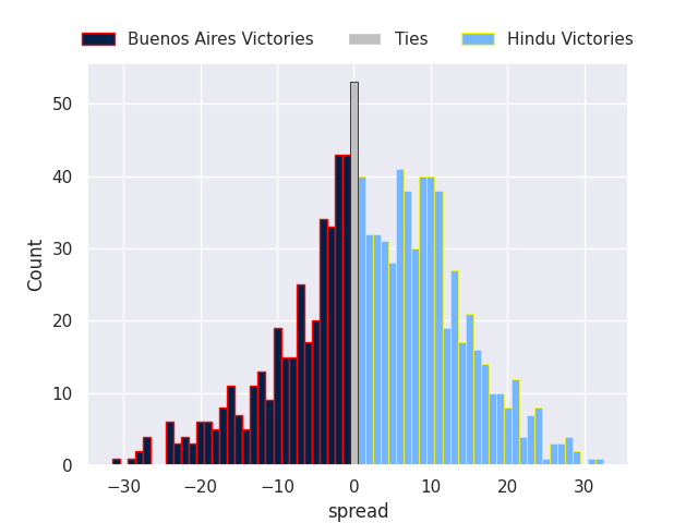 Each club has a rating and a rating deviation (similar to a Glicko rating), and expected performances can be generated. This allows for simulated matches and spreads like the ones below.