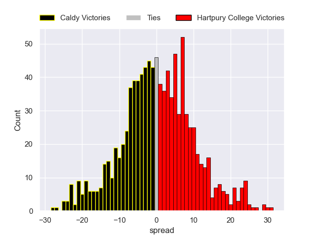Each club has a rating and a rating deviation (similar to a Glicko rating), and expected performances can be generated. This allows for simulated matches and spreads like the ones below.