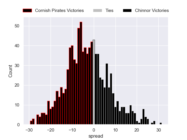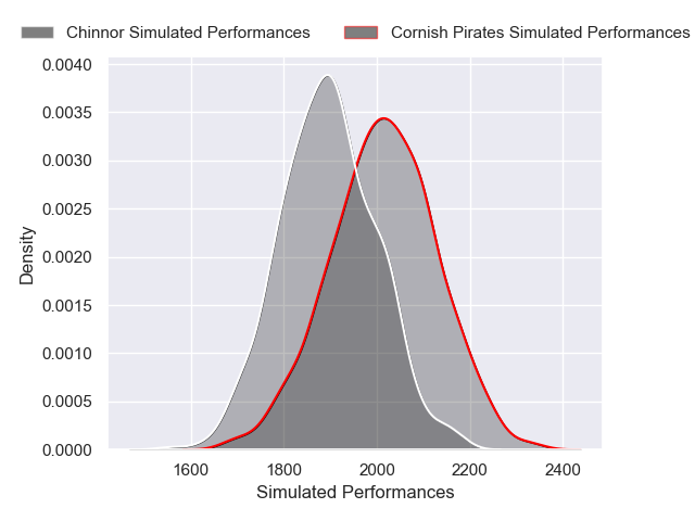 Each club has a rating and a rating deviation (similar to a Glicko rating), and expected performances can be generated. This allows for simulated matches and spreads like the ones below.