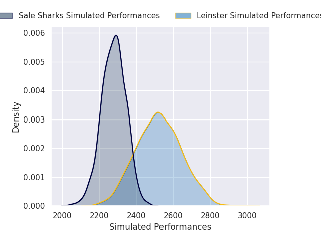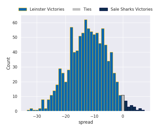 Each club has a rating and a rating deviation (similar to a Glicko rating), and expected performances can be generated. This allows for simulated matches and spreads like the ones below.