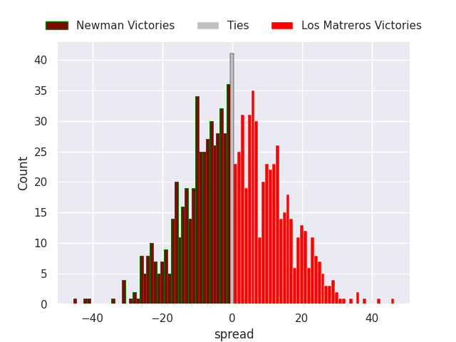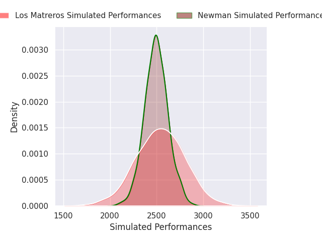 Each club has a rating and a rating deviation (similar to a Glicko rating), and expected performances can be generated. This allows for simulated matches and spreads like the ones below.
