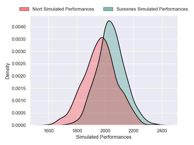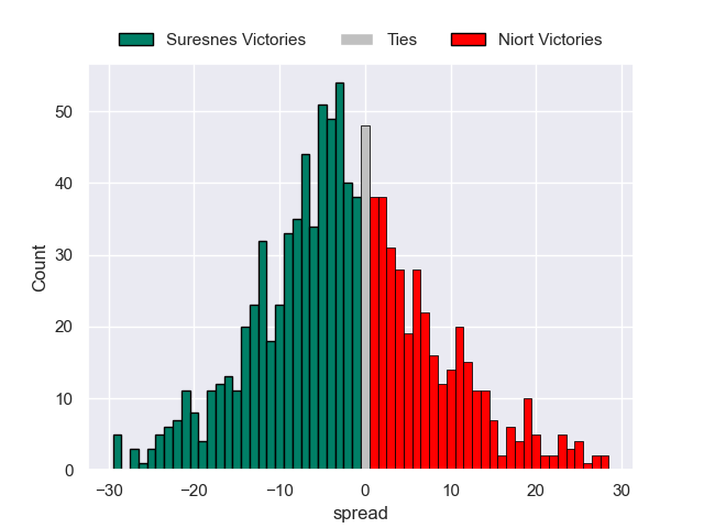 Each club has a rating and a rating deviation (similar to a Glicko rating), and expected performances can be generated. This allows for simulated matches and spreads like the ones below.
