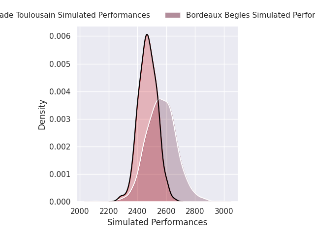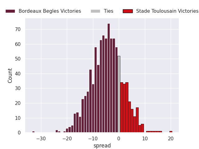Each club has a rating and a rating deviation (similar to a Glicko rating), and expected performances can be generated. This allows for simulated matches and spreads like the ones below.