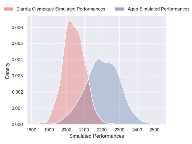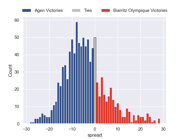 Each club has a rating and a rating deviation (similar to a Glicko rating), and expected performances can be generated. This allows for simulated matches and spreads like the ones below.