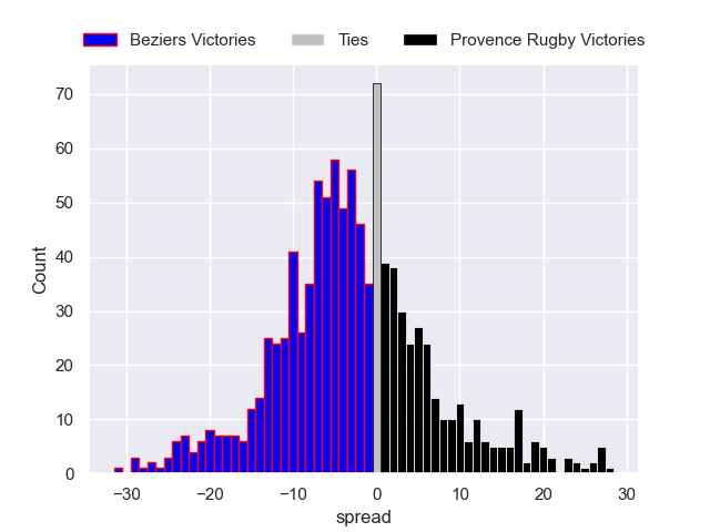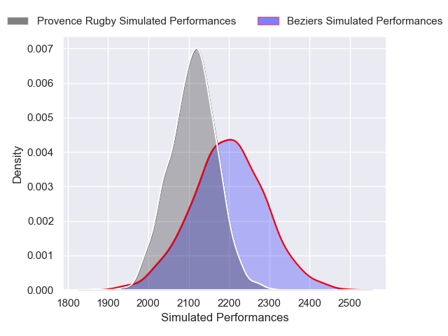 Each club has a rating and a rating deviation (similar to a Glicko rating), and expected performances can be generated. This allows for simulated matches and spreads like the ones below.