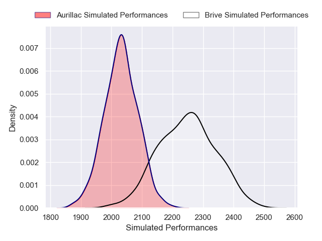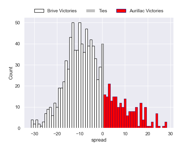 Each club has a rating and a rating deviation (similar to a Glicko rating), and expected performances can be generated. This allows for simulated matches and spreads like the ones below.