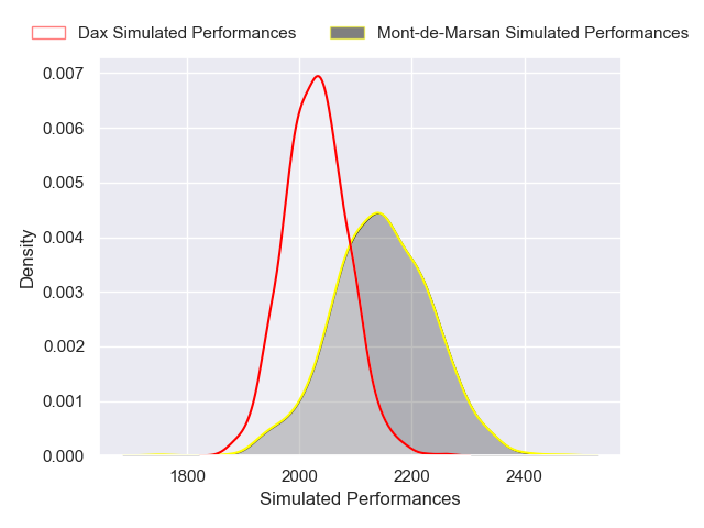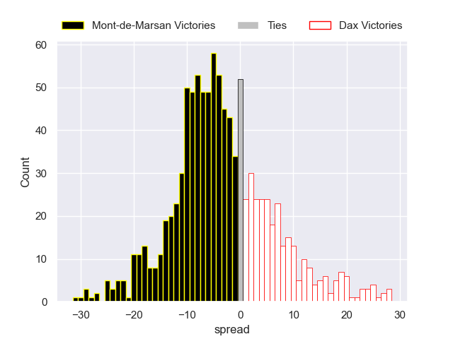 Each club has a rating and a rating deviation (similar to a Glicko rating), and expected performances can be generated. This allows for simulated matches and spreads like the ones below.