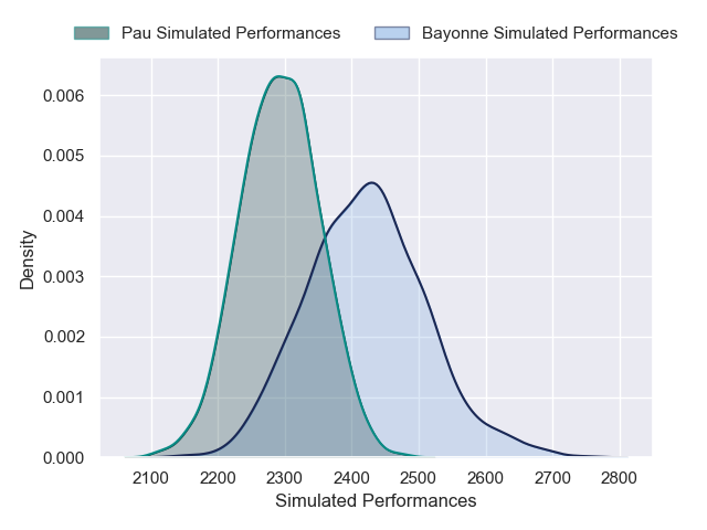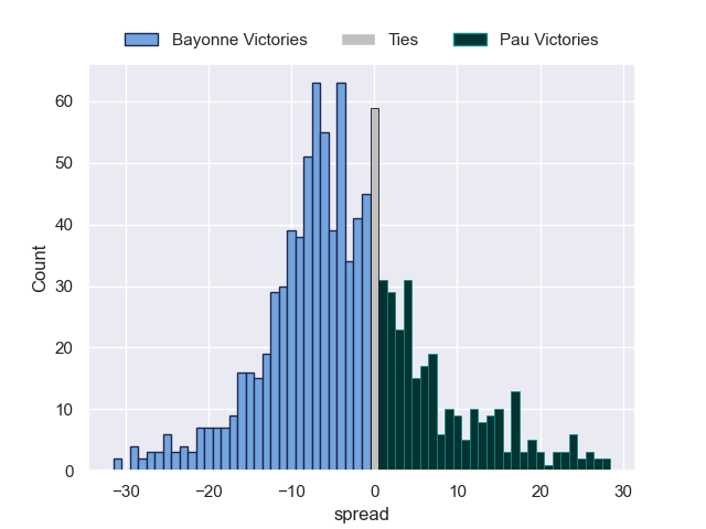 Each club has a rating and a rating deviation (similar to a Glicko rating), and expected performances can be generated. This allows for simulated matches and spreads like the ones below.
