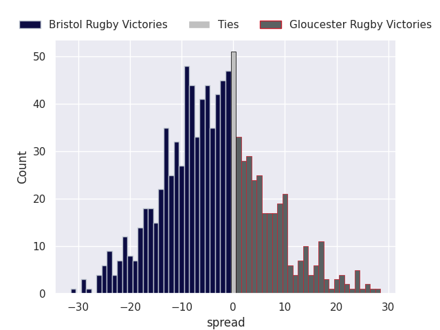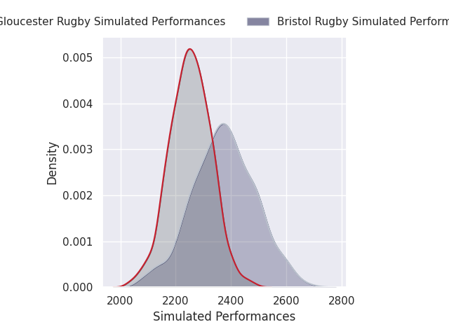 Each club has a rating and a rating deviation (similar to a Glicko rating), and expected performances can be generated. This allows for simulated matches and spreads like the ones below.