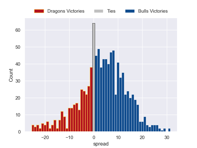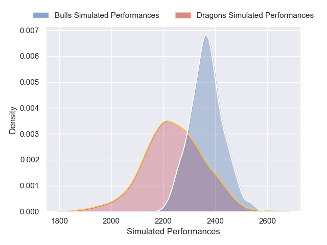 Each club has a rating and a rating deviation (similar to a Glicko rating), and expected performances can be generated. This allows for simulated matches and spreads like the ones below.