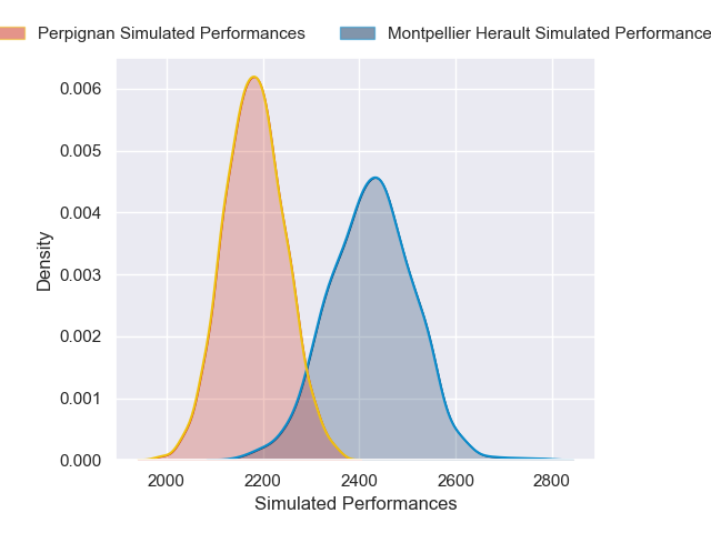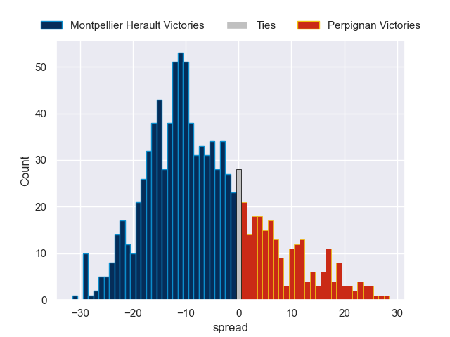 Each club has a rating and a rating deviation (similar to a Glicko rating), and expected performances can be generated. This allows for simulated matches and spreads like the ones below.