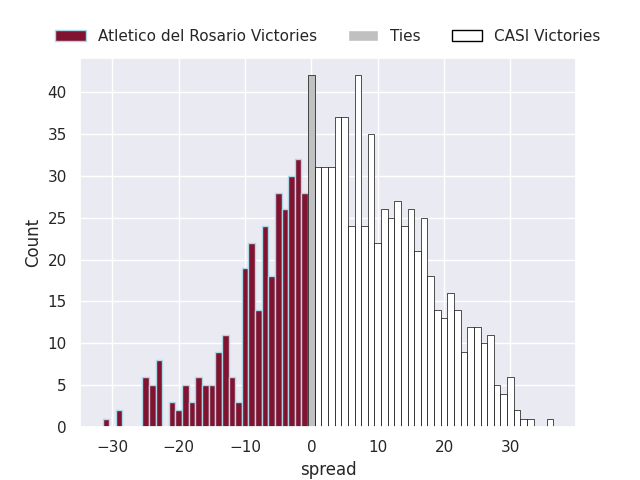 Each club has a rating and a rating deviation (similar to a Glicko rating), and expected performances can be generated. This allows for simulated matches and spreads like the ones below.