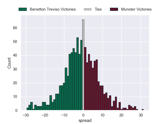 Each club has a rating and a rating deviation (similar to a Glicko rating), and expected performances can be generated. This allows for simulated matches and spreads like the ones below.