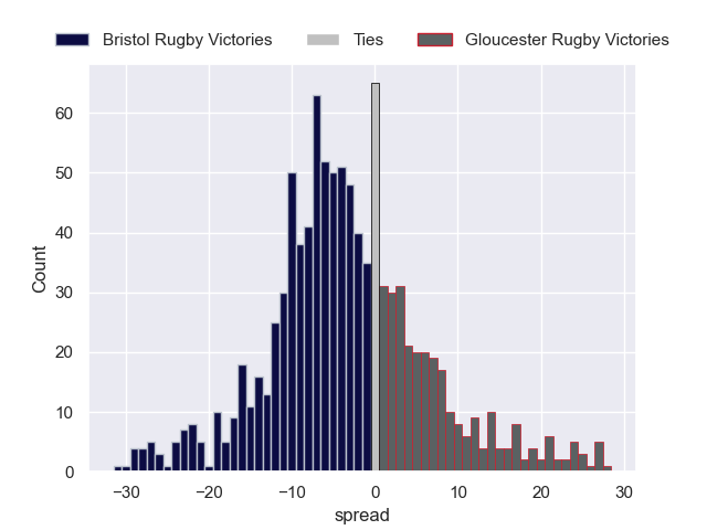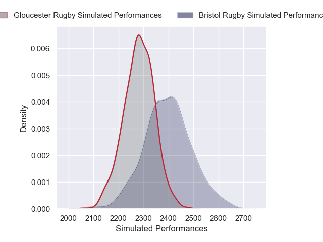 Each club has a rating and a rating deviation (similar to a Glicko rating), and expected performances can be generated. This allows for simulated matches and spreads like the ones below.