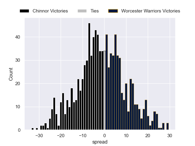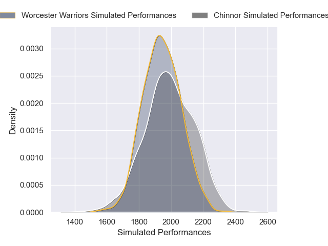 Each club has a rating and a rating deviation (similar to a Glicko rating), and expected performances can be generated. This allows for simulated matches and spreads like the ones below.