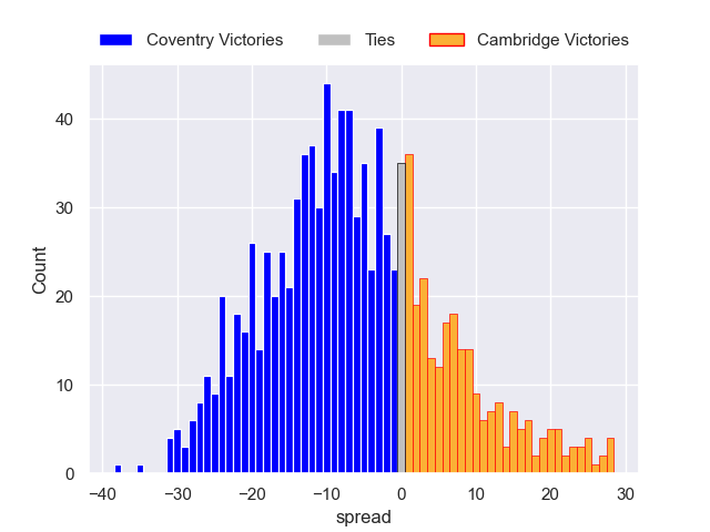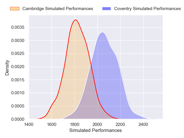 Each club has a rating and a rating deviation (similar to a Glicko rating), and expected performances can be generated. This allows for simulated matches and spreads like the ones below.