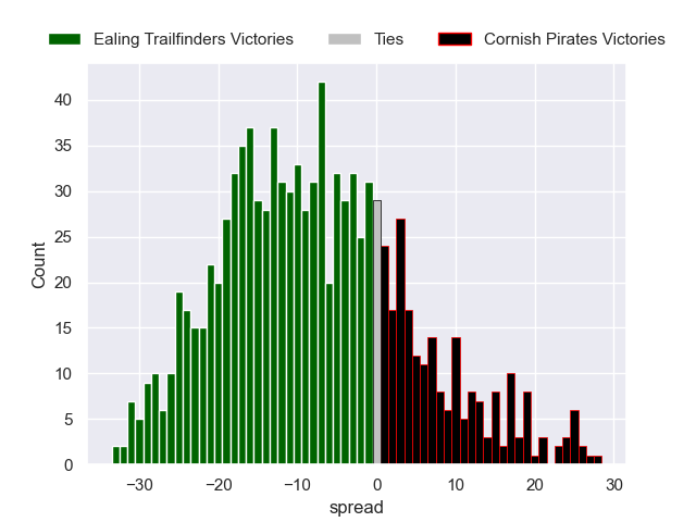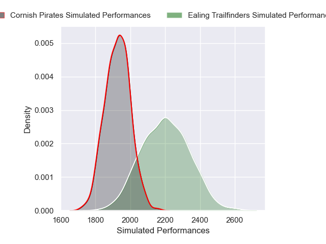Each club has a rating and a rating deviation (similar to a Glicko rating), and expected performances can be generated. This allows for simulated matches and spreads like the ones below.