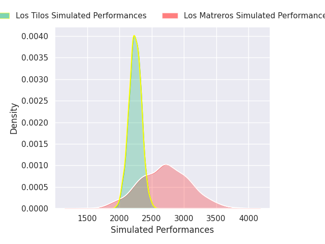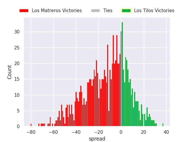 Each club has a rating and a rating deviation (similar to a Glicko rating), and expected performances can be generated. This allows for simulated matches and spreads like the ones below.