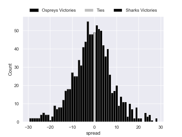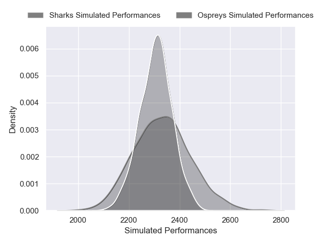Each club has a rating and a rating deviation (similar to a Glicko rating), and expected performances can be generated. This allows for simulated matches and spreads like the ones below.
