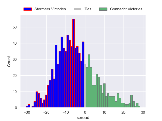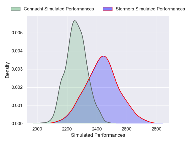 Each club has a rating and a rating deviation (similar to a Glicko rating), and expected performances can be generated. This allows for simulated matches and spreads like the ones below.