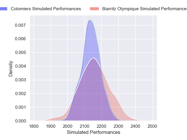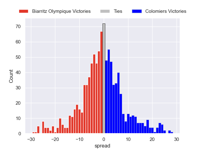 Each club has a rating and a rating deviation (similar to a Glicko rating), and expected performances can be generated. This allows for simulated matches and spreads like the ones below.