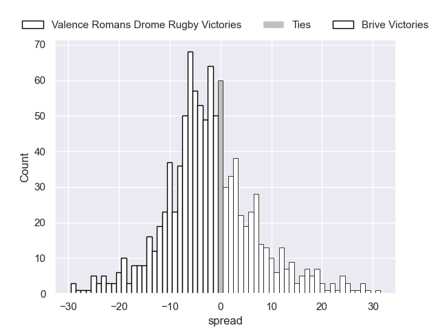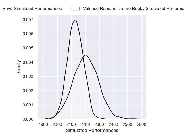 Each club has a rating and a rating deviation (similar to a Glicko rating), and expected performances can be generated. This allows for simulated matches and spreads like the ones below.